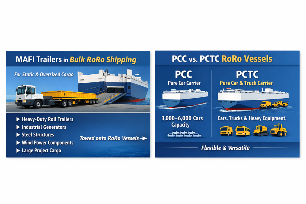However, not all cargo needs to be self-driven. Logistics operators can place static cargo on specialized platforms such as MAFI trailers, which are then towed onto the ship. As a result, RoRo vessels can carry both self-propelled vehicles and oversized industrial equipment.